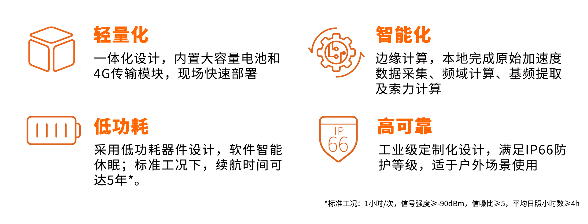 设备内置4G传输模块和大容量电池,顶部表贴微光太阳能板,无需依赖外部供电供网,现场可实现快速部署;具备远程升级、远程配置、低功耗管理、本地蓝牙配置和调试等多种功能。有效提升使用和维护效率,降低运营综合成本。