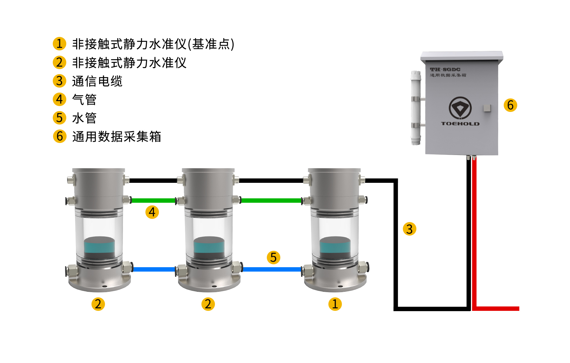 非接触式静力水准系统主要由静力水准仪(测点) 、连接线缆(包括数据总线、水管、气管)及通用数据采集箱组成。可以在被测结构物上布置静力水准测线以获得各测点的高程数据。