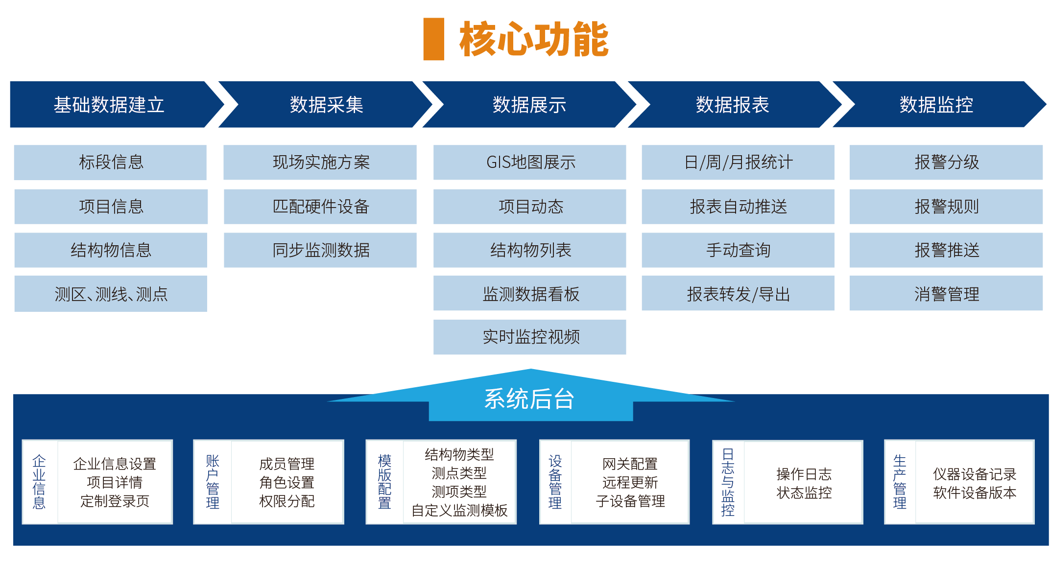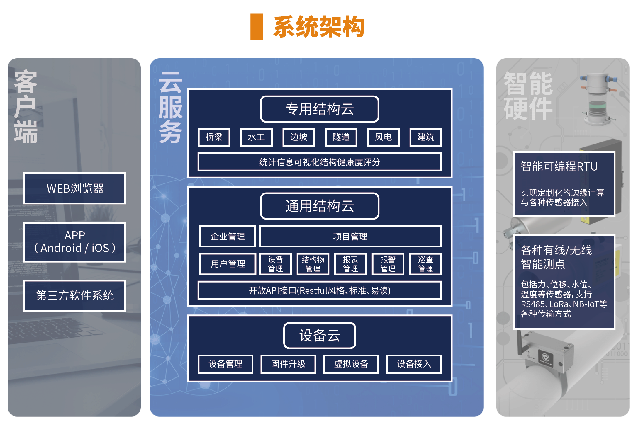 平台采用B/S架构,可对数据进行智能化管理,包含数据存储与分析、自动形成报表、结构物状态分析与报警、现场设备管理等多项功能。为用户提供真实的数据呈现,并针对结构物及结构物群构建安全模型,进行智能诊断和结构健康分析。